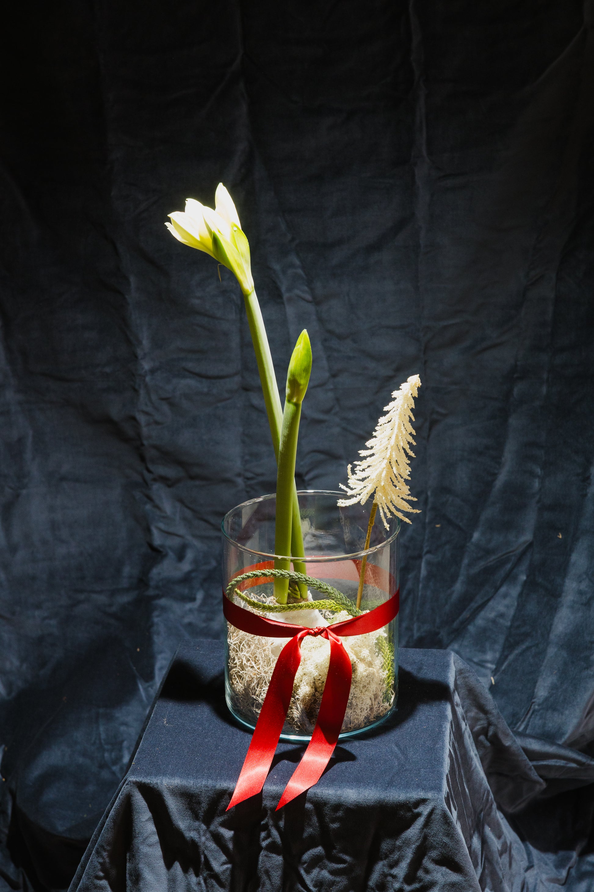 Božićni procvjetali vrt, amarilis u staklenoj posudi s različitim vrstama mahovine.